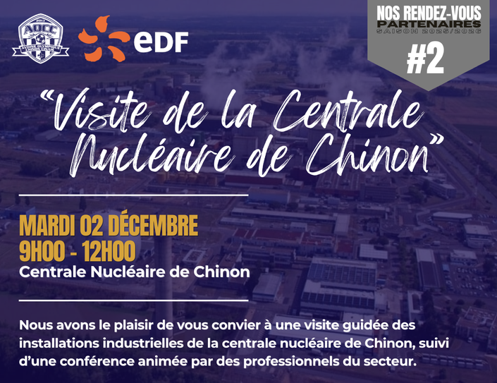 Après notre soirée de lancement, nous avons le plaisir de convier nos partenaires le mardi 02 décembre de 9H00 à 12H00 à notre deuxième temps fort partenaires : une visite guidée des installations industrielles de la centrale nucléaire de Chinon, suivie d’une conférence animée par des professionnels du secteur.